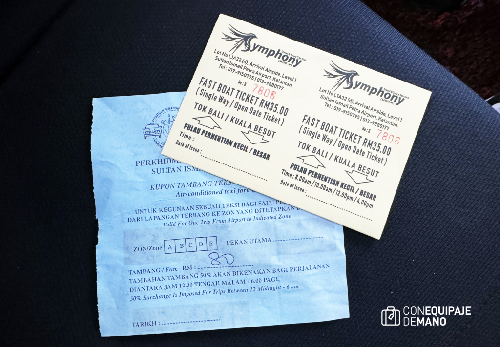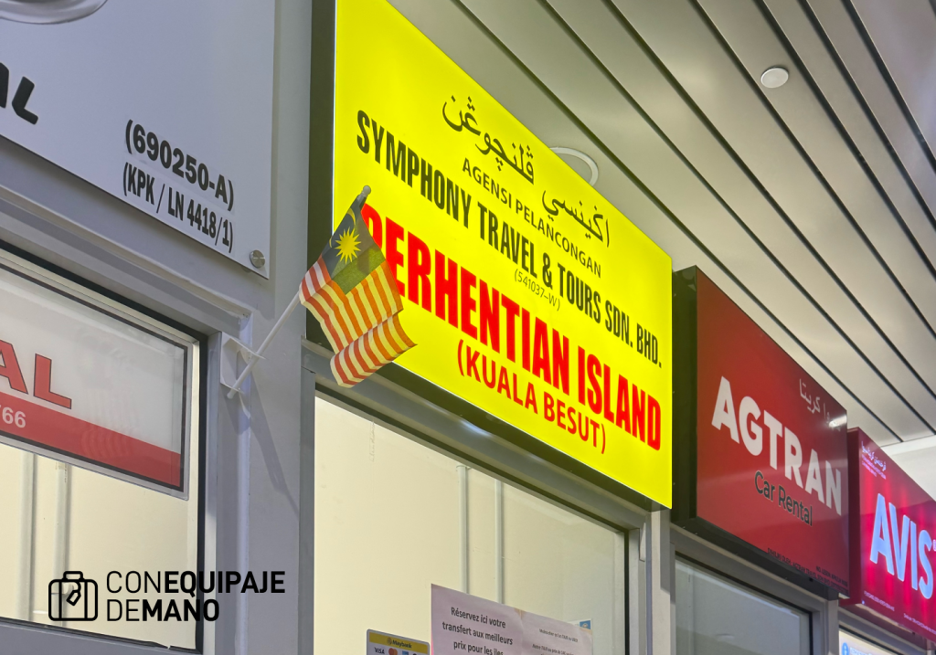 Nada más salir de la zona de recogida de equipaje verás varias oficinas de alquier de coche y excursiones. Nosotros nos acercamos a una que se llamaba Symphony, aunque supongo que habrá otras similares y con los mismos precios (están regulados). Aquí la chica que nos atendió, directamente nos juntó con otro viajero que iba solo, para que pagásemos menos. Pagamos 80 ringits entre todos (unos 16€ a repartir) por el taxi hasta Kuala Besut (más de una hora), y otros 70 ringits por persona (unos 14€), por el barco de ida y vuelta a Perhentian.