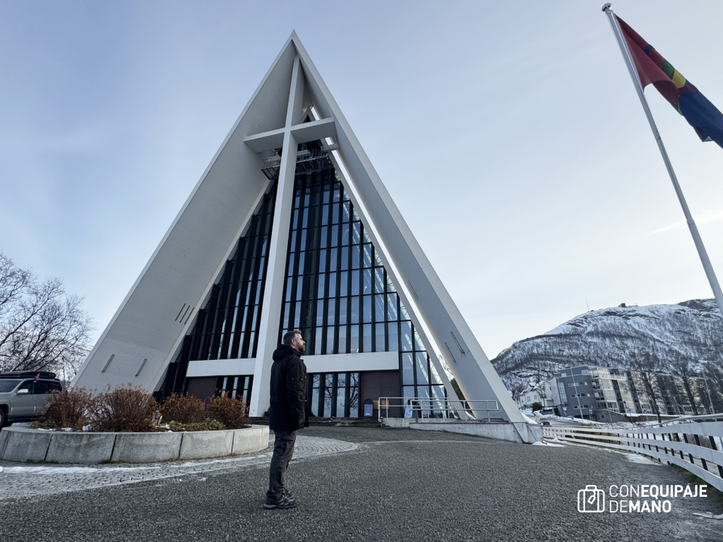 - La Catedral del Ártico (Ishavskatedralen), el edificio más icónico de la ciudad, con su arquitectura triangular inspirada en los glaciares y sus impresionantes vitrales. Parece súper moderna pero en realidad es de 1965. Diseñada por el arquitecto noruego Jan Inge Hovig, quién se inspiró en los glaciares y las montañas que rodean la ciudad. Aunque su nombre pueda confundir, no es una catedral en sentido estricto, sino una iglesia parroquial, pero su imponente silueta la ha convertido en uno de los edificios más fotografiados del norte de Noruega. En su interior destaca un impresionante mosaico de vidrio, añadido en 1972, que representa el regreso de Cristo y filtra la luz ártica creando una atmósfera única, especialmente durante los conciertos nocturnos bajo las auroras boreales o el sol de medianoche. La entrada cuesta unos 8€ al cambio.