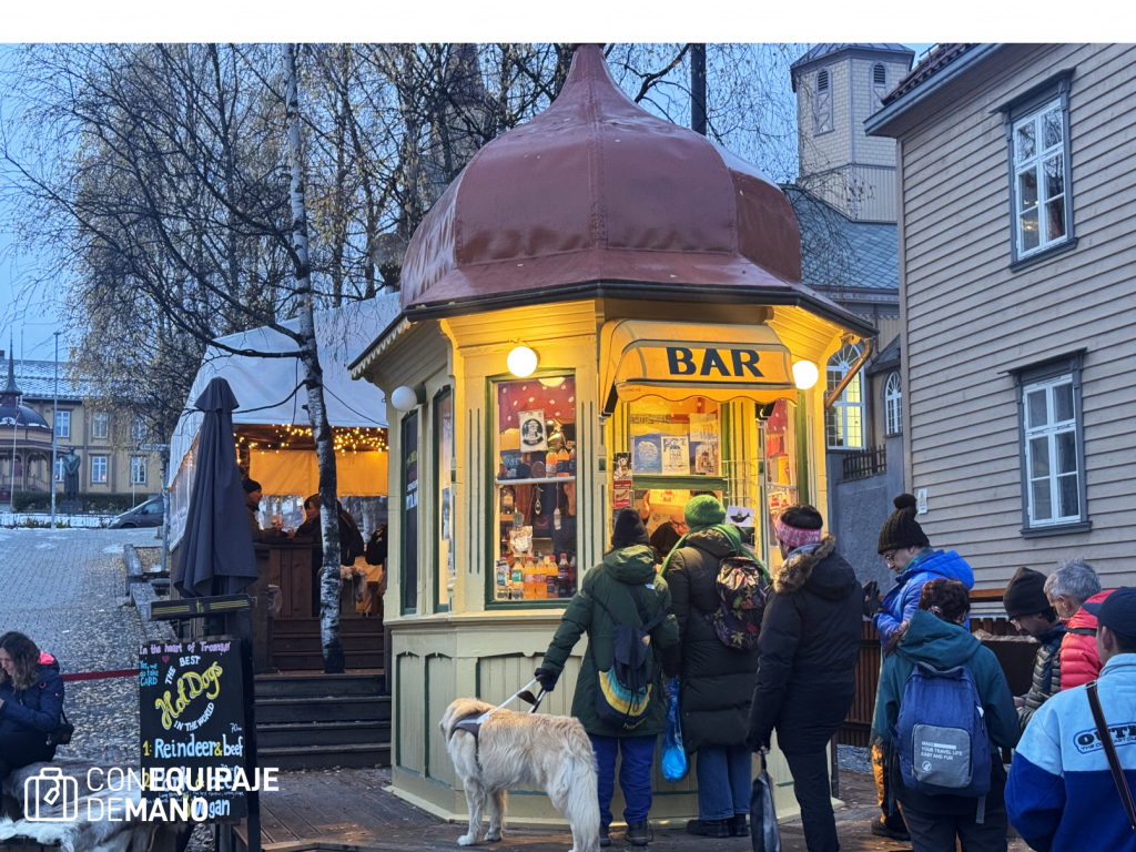 - Como visitas curiosa, en plena Storgata se encuentra Raketten, un local que se ha hecho famoso por ser el bar más pequeño del mundo. En realidad es un pequeño kiosko en el que puedes probar el perrito de carne de reno, pero también lo tienes de ternera o vegano. Tiene una pequeña terraza dónde comértelo tranquilamente. Te lo preparan con salsa, pepinillo, cebolla… Y está bastante bien. Y también, cerca de alli, hay otro antiguo kiosko, el Siste Skanse (se traduce como «La última resistencia»), y es conocido por ser el estudio fotográfico más pequeño del mundo. Desgraciadamente ya no funciona como estudio, y es también un local de perritos (no me preguntéis por qué esa obsesión).