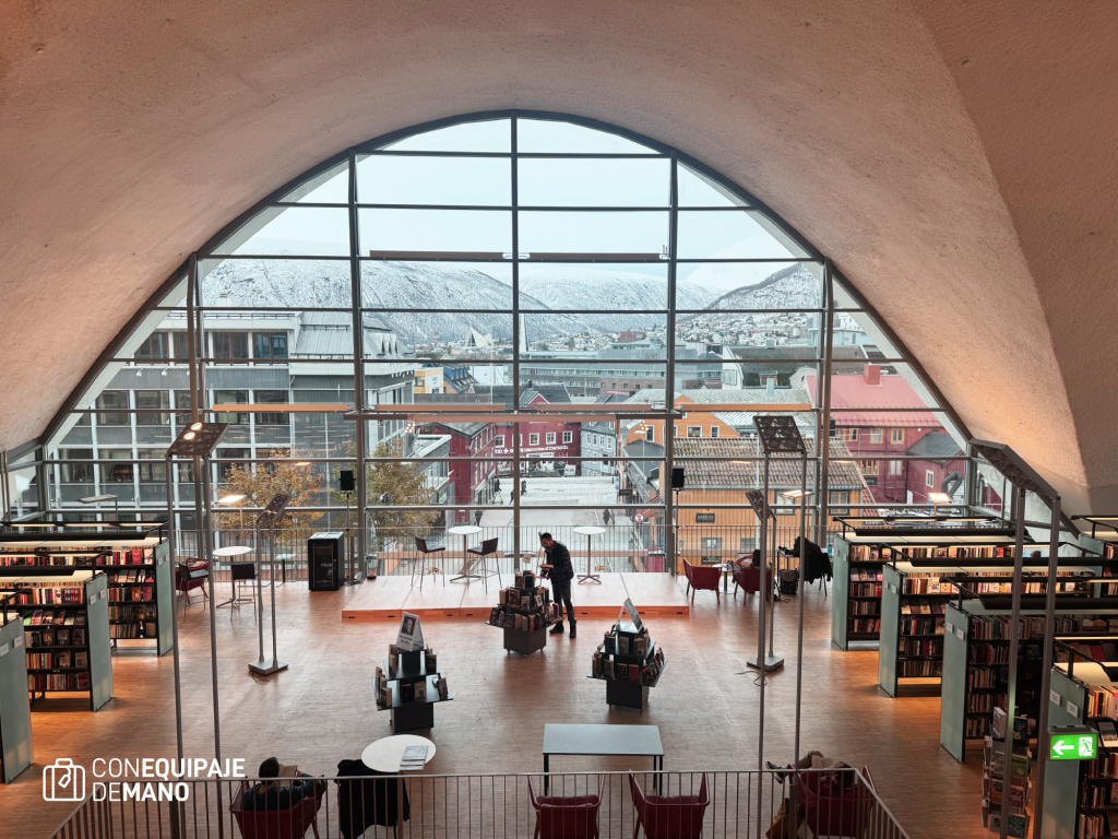 - La Biblioteca Pública de Tromsø es mucho más que un lugar para leer: es uno de los espacios más acogedores y luminosos de la ciudad. Ocupa un edificio moderno en pleno centro, diseñado con grandes ventanales que dejan entrar la luz ártica incluso en los días más cortos del invierno. Su estructura se inspira en un antiguo hangar de barcos reutilizado, lo que le da un encanto industrial y cálido a la vez. Es un refugio perfecto para hacer una pausa entre visitas, puedes tomarte un café y entrar en calor, también tienes baños públicos, y wifi gratuito.